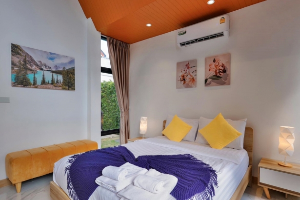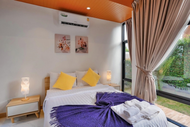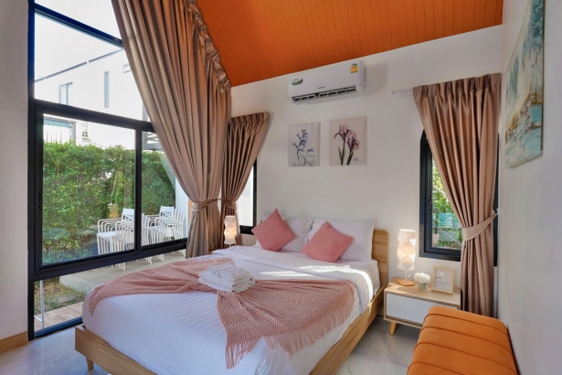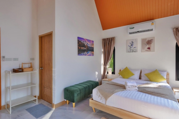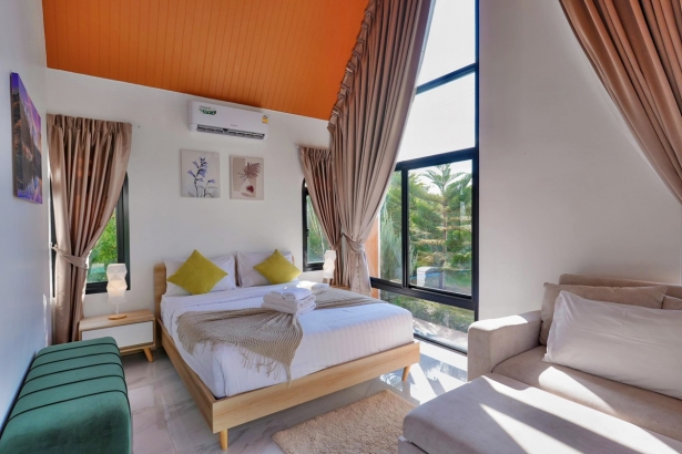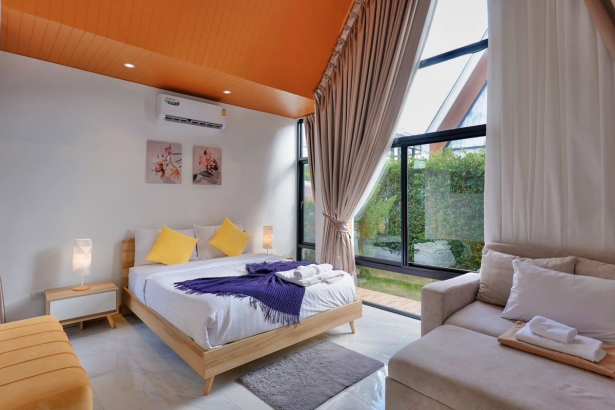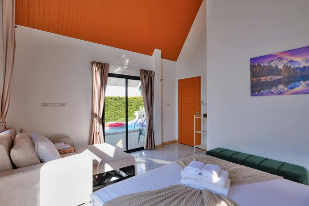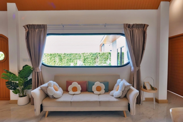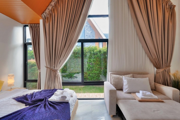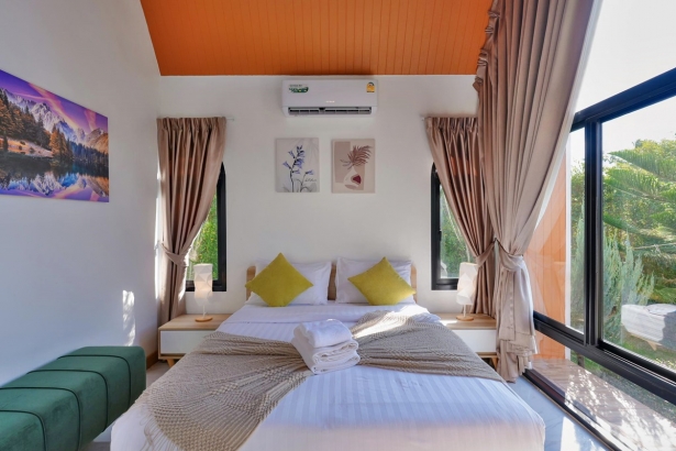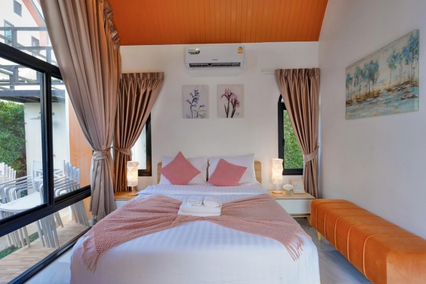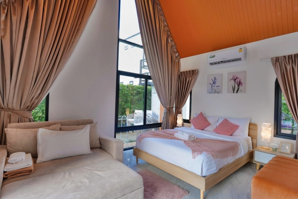 - มีเตียง 5 ฟุต ห้องละ 1 เตียง และโซฟาเบดขนาดใหญ่ห้องละ 1 ตัว (ห้องน้ำในตัวทุกห้อง)