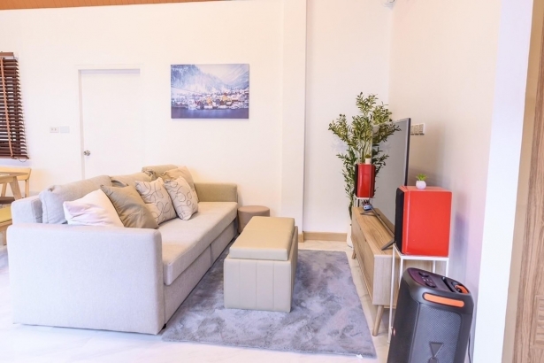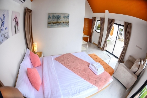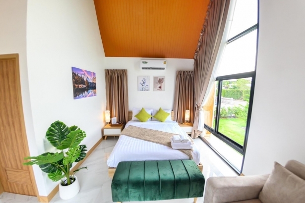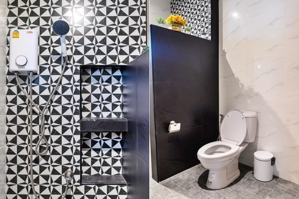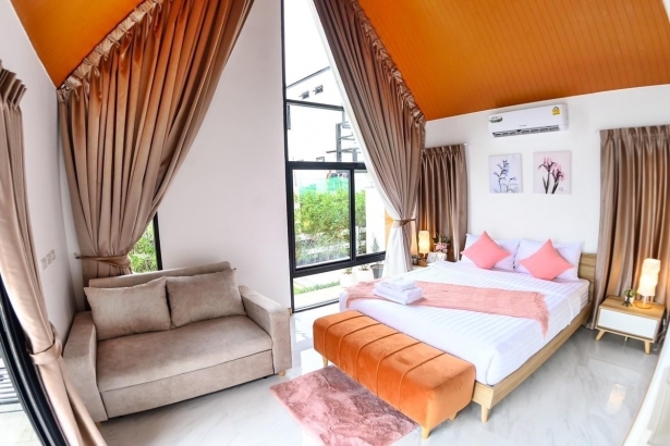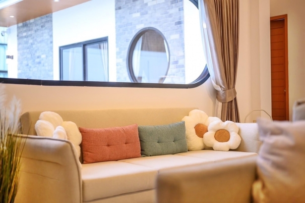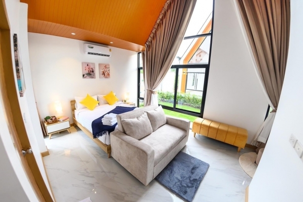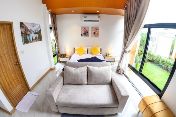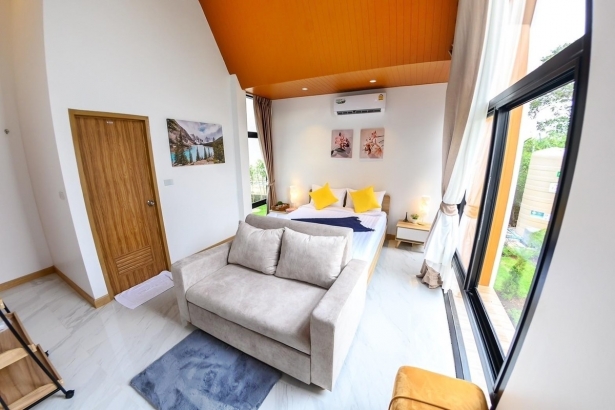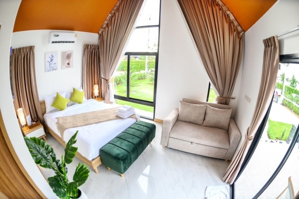 - มีเตียง 5 ฟุต ห้องละ 1 เตียง และโซฟาเบดขนาดใหญ่ห้องละ 1 ตัว (ห้องน้ำในตัวทุกห้อง)