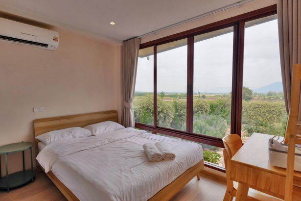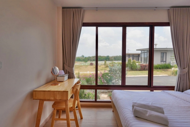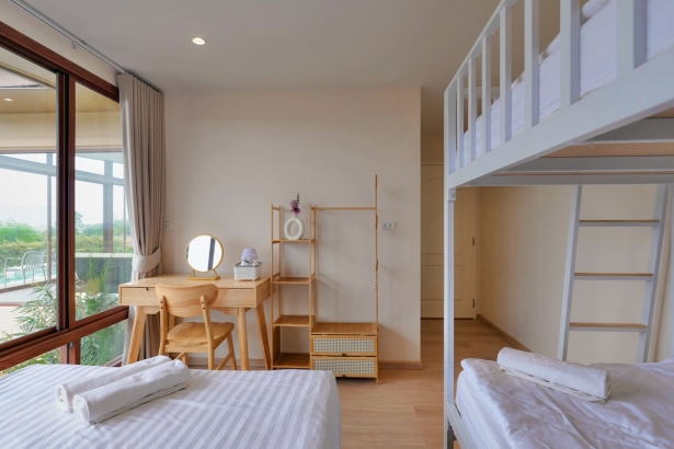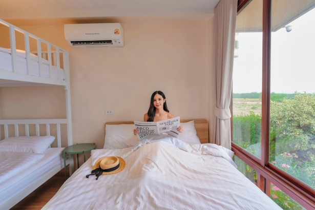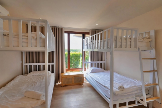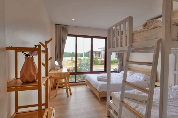 - บ้านพักมี 3 ห้องนอน 3 ห้องน้ำ (ห้องน้ำในตัวทุกห้อง) แต่ละห้องนอนได้ 4 ท่าน
