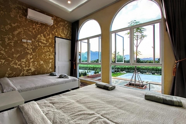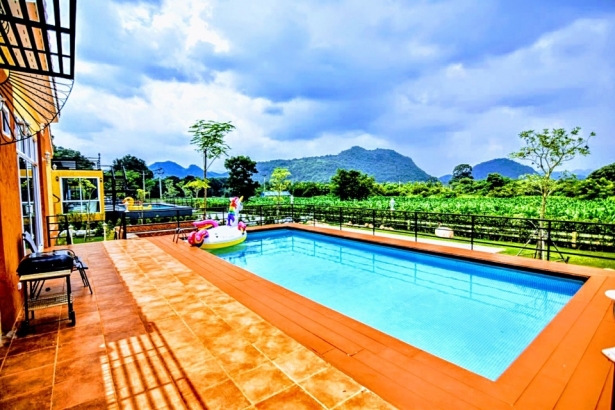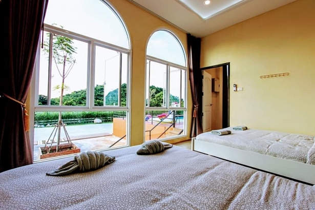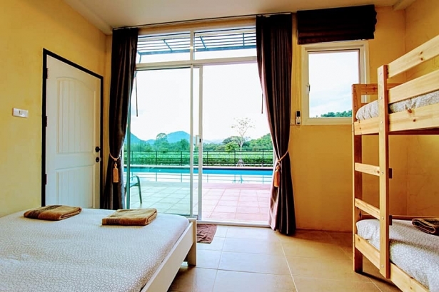 มี เตียงขนาด 5 ฟุต 3 เตียง และ เตียงนอน 2 ชั้น 1 เตียง - ระเบียงริมสระ