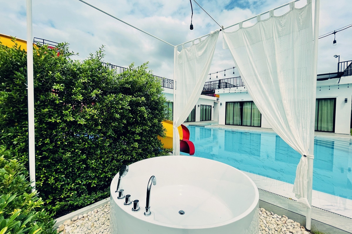 – ห้องที่ 4 มีเตียง 6 ฟุต 1 เตียง, เตียง 2 ชั้น 3 ฟุต 1 เตียง - สระว่ายน้ำส่วนตัว (8×10 ม. ลึก ไม่เกิน 1.5 ม.)